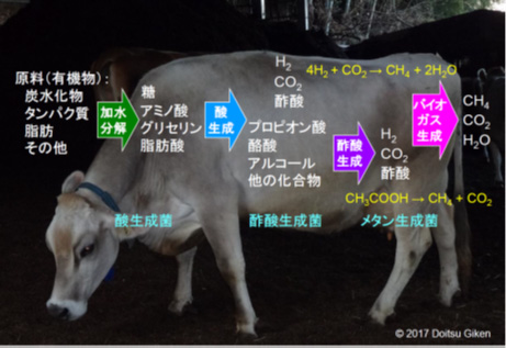 図1: 牛の消化器官を手本にしたメタン発酵の原理