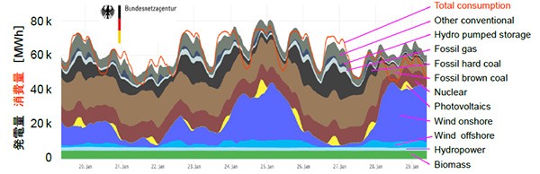 図2にドイツ国内における実際の発電量と消費量を示す。今年、1月下旬のデータである。色により発電方式が異なる。朱色の線は消費量。消費量も、発電量も、バイオマス(緑色)と水力(薄水色)発電以外は、大きく変動している。発電量の変動は、電源周波数を一定にさせるために好ましくない。特に回転数を正確に保たなくてはならない機器には大きな問題となる。