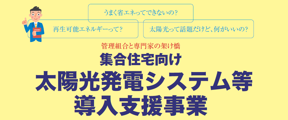 本事業は、福岡市が「集合住宅向け太陽光発電システム等導入支援事業」を推進するため、市内の分譲集合住宅の管理組合に対して太陽光発電アドバイザー等の専門家を派遣するものであり、福岡市(及び委託事業者であるNPO法人 日本住宅性能検査協会)が個別の契約等に責任を負うものではありません。 |